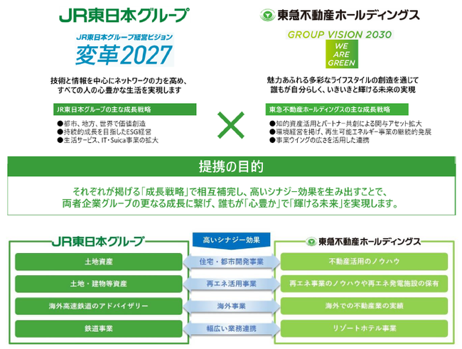 JR東日本グループが掲げるすべての人の心豊かな生活を目指す「変革2027」、東急不動産ホールディングスの「環境経営」と「DX」を全社方針に掲げた長期ビジョン「GROUP VISION 2030」を、両社が連携することで加速していきます。さらにその先の社会課題解決と両社グループの収益力強化を通じた企業成長を目的に、住宅事業、再生可能エネルギー事業を軸とした事業を推進します。