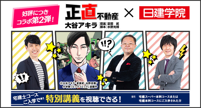 資格取得支援スクールの日建学院を運営する株式会社建築資料研究社(所在地:東京都豊島区、代表取締役社長:馬場栄一)は、2023年度宅地建物取引士試験を受験される方向けに、小学館「ビッグコミック」にて連載中の漫画『正直不動産』(漫画・大谷アキラ、原案・夏原武、脚本・水野光博)とコラボし特別講義を制作いたしました。