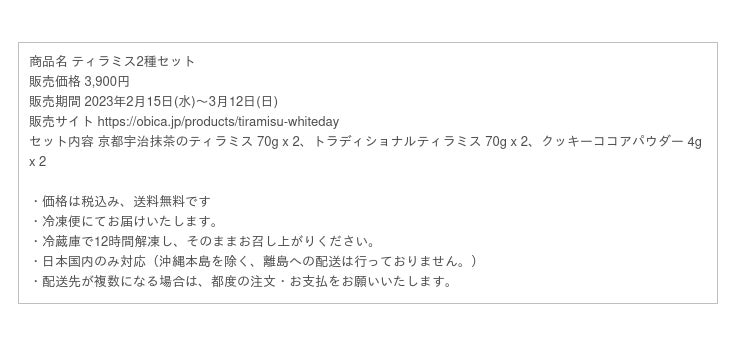 京都の宇治抹茶とトラディショナルの2種フレーバー https://obica.jp/products/tiramisu-whiteday