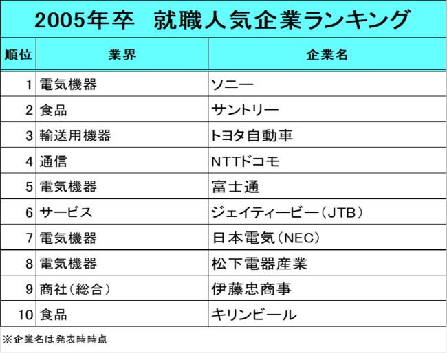 20年前にあたる、2005年卒の「就職人気企業ランキング」では、1位のソニーを筆頭に、5位に富士通、7位に日本電気(NEC)、8位に松下電器産業(現:パナソニック)が続きました。上位10社のうち、「電気機器メーカー」が4社を占めています。また、2位にサントリー、10位にキリンビールと「食品メーカー」も複数社ランクインしている他、3位にトヨタ自動車が入っており、20年前は「メーカー」が根強い支持を集めていたことが分かります。