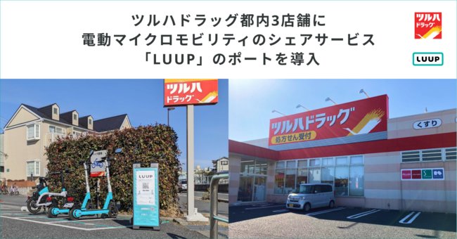 株式会社Luup(本社:東京都千代田区、代表取締役社長兼CEO:岡井大輝、以下「Luup」)は、株式会社ツルハ(本社:北海道札幌市、代表取締役社長:八幡政浩、以下「ツルハ」)と連携し、初のドラッグストアのポートとして、都内のツルハドラッグ3店舗に電動マイクロモビリティのシェアサービス「LUUP」のポートを導入したことをお知らせします。それを記念し、対象ポートにて発着したLUUPユーザーにご利用いただけるお得なキャンペーンを2つの期間で実施します。