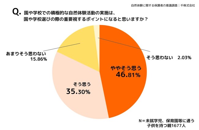 実際に、園や学校での積極的な自然体験活動の実施が園や学校選びの際の重要視するポイントになると思うかどうか質問したところ、「ややそう思う」(46.81%)「そう思う」(35.30%)で82.11%の保護者が園や学校選びの際に重要視しているようです。