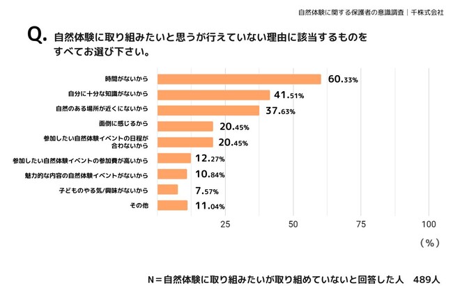 その理由を質問したところ、「時間がないから」(60.33%)を選択した保護者が一番多く、「自分に十分な知識がないから」(41.51%)「自然のある場所が近くにないから」(37.63%)が続きました。自然体験を園・学校で行っていると回答した保護者が一番多いことから、こういった保護者の課題を解決するためには今後さらに園や学校の協力が求められそうです。