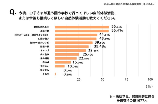 今後園や学校で行ってほしい自然体験活動、または今後も継続してほしい自然体験活動について質問したところ、1位が「動物に触れあう」(56.83%)2位が「農業体験」(56.41%)と、次いで「森林の中で遊ぶ(施設なども含む)」(44.54%)も併せて、保護者が日常では経験させづらい体験を園や学校に期待していると言えそうです。一方で、その後に続く「公園で遊ぶ」(43.59%)「虫取りや魚釣りなど」(39.59%)からも、普段の活動を継続することも保護者にとって重要な役割を果たしているといえるでしょう。