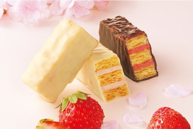 柔らかで優しい香りのさくらの葉エキスを使用したクリームをサンドし、ホワイトチョコレートでコーティングした「さくら」と、福岡県産あまおう苺の甘みと酸味が調和した風味の良いクリームをサンドし、スイートチョコレートでコーティングした「あまおう苺」。ミルフィーユのサクサク軽い食感と一緒に、2つの異なる春の味をお楽しみいただけます。
