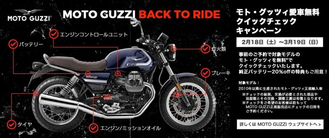 このキャンペーンは、本格的なツーリングシーズンを迎える前に、安心してお客様の愛車にお乗りいただくた めに、モト・グッツィ正規販売店による特定のチェック項目を無料で点検いたします。さらに、このクイックチェッ クキャンペーン実施時に純正バッテリーに交換した場合は、バッテリー本体の代金を通常価格より 20%割引い たします。