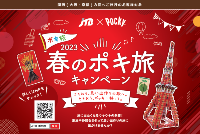 株式会社JTB(以下、JTB)は、江崎グリコ株式会社(以下、江崎グリコ)の「ポッキー」ブランドとタイアップして、大阪および京都を目的地とした「2023春のポキ旅キャンペーン」を2023年3月1日(水)~5月31日(水)ご宿泊を対象に実施します。