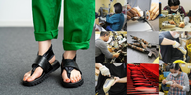 神戸・長田で40年以上も靴づくりを続けてきた工房が、ずっと大切にしてきた定番のトングシューズ。「毎日履けるように」と丁寧に作られたそのクオリティーと真摯にモノづくりに向き合う姿勢に惚れ込んだ、日本職人プロジェクト特別バージョン。今シーズンのNEWカラーは、ベーシックでありながら個性が光る〈クロコ型押し柄・ブラック〉。21.0~26.5cmまで対応する充実のサイズ展開で、素足でさらっと履くのはもちろん、5本指や足袋ソックスを合わせればシーズンレスに活躍します。