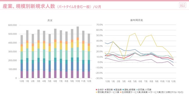 新規求人数は、前年同月より+4.8%と前月(+8.7%)の伸びよりやや鈍化しました。伸び率トップ3は生活関連サービス業,娯楽業(18.5%増)、サービス業(他に分類されないもの)(7.9%増)、宿泊業,飲食サービス業(6.9%増)となりました。宿泊業,飲食サービス業の伸び率は8か月連続トップでしたが、今月はやや鈍化。一方で建設業(6.2%減)、製造業(0.1%減)は減少しました。