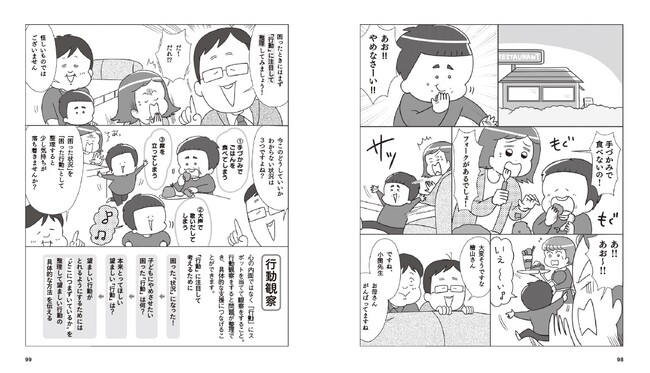 また、こどもの行動に着目して問題行動をサポートするための心得など、発達障害児のサポートのために親が知っておきたいけれど専門的で難しい内容も、ストーリーマンガでわかりやすく知ることができます。