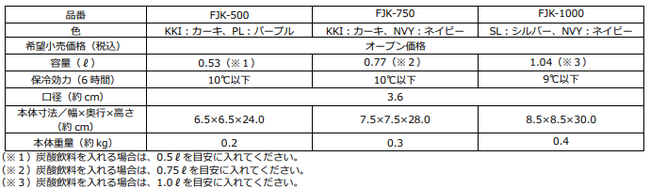『サーモス 保冷炭酸飲料ボトル(FJK-500/750/1000)』 仕様一覧