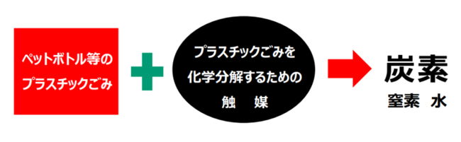 説明:ペットボトル等のプラスチックごみを、化学分解により炭素化する機械です。プラスチックごみを化学分解するための触媒とプラスチックごみを、80度から200度の温度域で所定の時間、接触させることで、プラスチックごみが炭素化します。燃焼過程がないため、温室効果ガス、すなわち二酸化炭素も、ダイオキシンも、一切発生いたしません。プラスチックごみ炭化装置によりできた炭素は、タイヤの原料やリチウム電池の電極などに再利用することができるため、今まで廃棄処分されていたペットボトル等のプラスチックごみが、新たな付加価値を生み出す材料として生まれ変わることができます。