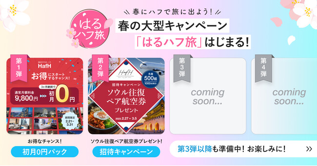 2023年2月21日より、春の大型キャンペーン「はるハフ旅」を開催します。本キャンペーンは、新規会員・既存会員ともに、旅のサブスク(TM)「HafH」をもっと楽しむための大型キャンペーンです。