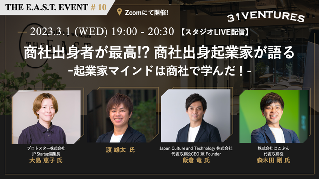 プロトスター株式会社(本社:東京都中央区、代表取締役社長:前川英麿、以下プロトスター)は、31VENTURESと共催で「起業家に商社出身者が多い理由とは。商社で学んだ「起業家マインド」を語る」(https://theeast230301.peatix.com/event/3494774/view)オンラインイベントを3月1日(水)に開催いたします。