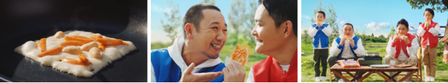 千鳥と、本人にそっくりな小千鳥が、テントの近くで「亀田の柿の種」を持って、なにか作ろうとする様子から始まる今回のCM。フライパンで加熱して、ふつふつとしたスライスチーズの上にパラパラと「亀田の柿の種」をかけて出来上がった「柿の種チーズせんべい」。大悟さんがノブさんへ「どうぞぅ」と勧めると、そのおいしさに「カリッとうまし!」と感動する4人。思わず試してみたくなる、シズル感たっぷりなCMカットが印象的です。