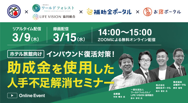 3月9日(木)、3月15日(水)※、株式会社お宿ポータルは、【全旅連 竹村 奉文氏】【一般社団法人ワールドフォレスト/LIFEVISION協同組合 鈴木 淳司氏】【株式会社補助金ポータル 船木 智史氏】をお迎えして、宿泊・観光事業者向けに、助成金を活用した人手不足解消法をお伝えするオンラインセミナーを開催します。