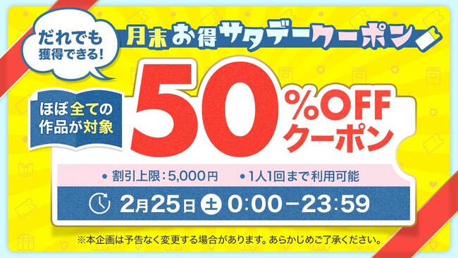 電子書籍販売サイト「ebookjapan」をヤフー株式会社と協力して運営する株式会社イーブックイニシアティブジャパンは、「ebookjapan」で電子書籍を購入すると、50%OFFクーポンがもらえる「月末お得サタデー」を2月25日(土)に実施します(上限5,000円、1人1回)。