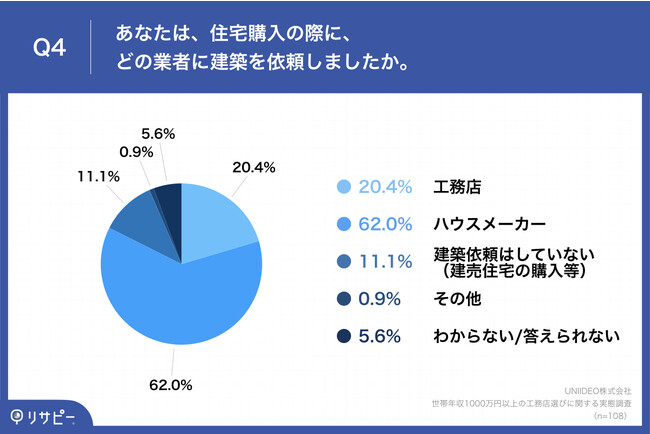 「Q4.あなたは、住宅購入の際に、どの業者に建築を依頼しましたか。」(n=108)と質問したところ、「工務店」が20.4%、「ハウスメーカー」が62.0%という回答となりました。
