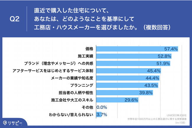 「Q2.直近で購入した住宅について、あなたは、どのようなことを基準にして工務店・ハウスメーカーを選びましたか。(複数回答)」(n=108)と質問したところ、「価格」が57.4%、「施工実績」が52.8%、「ブランド(理念やメッセージ)への共感」が51.9%という回答となりました。