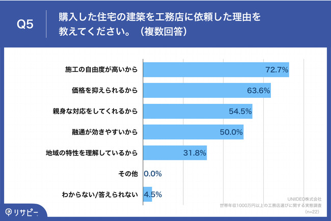 Q4で「工務店」と回答した方に、「Q5.購入した住宅の建築を工務店に依頼した理由を教えてください。(複数回答)」(n=22)と質問したところ、「施工の自由度が高いから」が72.7%、「価格を抑えられるから」が63.6%、「親身な対応をしてくれるから」が54.5%という回答となりました。