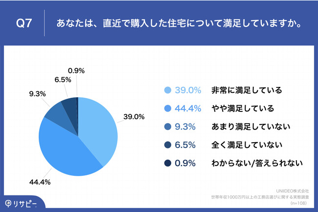「Q7.あなたは、直近で購入した住宅について満足していますか。」(n=108)と質問したところ、「非常に満足している」が39.0%、「やや満足している」が44.4%という回答となりました。