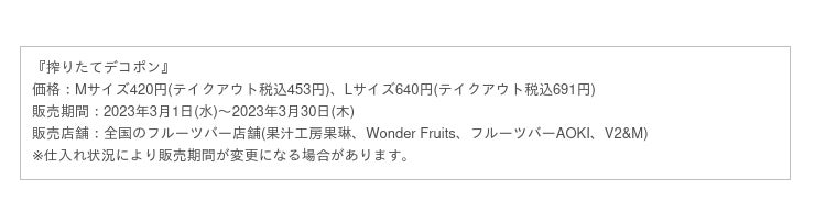 青木フルーツホールディングス株式会社(本社:福島県郡山市、代表取締役会長兼社長:青木信博)が運営する業界シェアNo.1のジューススタンド「果汁工房果琳」をはじめとしたフルーツジュースバー全185店では、春の訪れを感じるドリンク『搾りたてデコポン』を、2023年3月1日(水)~2023年3月30日(木)まで期間限定で販売いたします。また98店限定で、“みかんの大トロ”と呼ばれる「せとか」をふんだんに使用した『搾りたてせとか』を2023年2月27日(月)から数量限定で販売いたします。