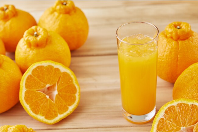 デコポンは、清見オレンジとポンカンを交配して誕生した、頭の部分が出っ張っているのが特徴的な柑橘「不知火(しらぬい)」の中でも、「糖度13度以上」「酸度1%以下」などの厳しい基準をクリアしたものだけが名乗ることができる名称で、豊かな甘みと程よい酸味、爽やかな香りを感じられる保証付きの美味しさを持つフルーツです。さらに、デコポンにはビタミンCが100g中48mgと、みかん(100g中33mg)よりも多く含まれます。デコポンの皮を剥く手間なく、デコポンが持つ栄養や美味しさを、作りたてでお楽しみいただけます。
