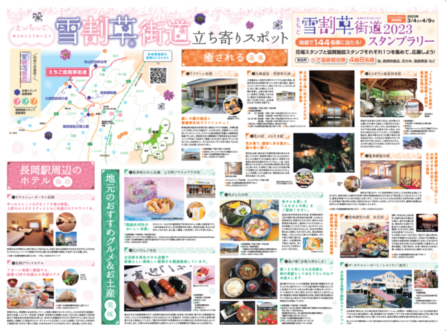 この「雪割草」の花場4か所(大崎雪割草の里・雪国植物園・国営越後丘陵公園・本山村田妙法寺)と越後長岡の奥座敷、蓬平(よもぎひら)温泉、近隣の宿泊・食事施設や大崎雪割草の湯などの入浴施設を結び、スタンプラリーを開催します。