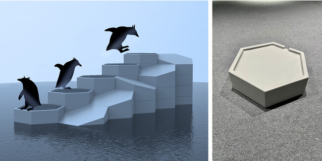 『AOAO SAPPORO』では、ペンギンたちが生き生きと、楽しく過ごすことができる環境づくりを目指して、ペンギンの行動や生態などの知見をもとに(※2)展示水槽を開発しました。この水槽の陸場は自然の岩場を再現した形状ではなく、六角形のブロックを組み合わせたデザインになっています。使用するブロックの数や組み合わせを変えることで、陸場の形状を容易に変更し、環境に変化を起こし続けることが可能な世界初(※1)の仕組みとなっています。また、ブロックの高さは、陸場を“ホップ”して(飛び跳ねて)移動する習性があるイワトビペンギン(英名:ロックホッパーペンギン)の特性が活かせるように設計されており、イワトビペンギンのダイナミックな行動が間近で観察できる展示になっています。