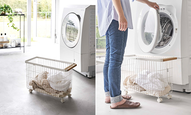 洗濯機の幅に合うワイドなキャスター付きランドリーバスケット。