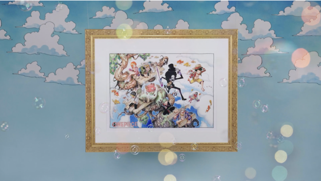 また、「In the Sky」のエキシビション公開にあわせて、『ONE PIECE』で描かれる特徴的な雲をバックに、額装した集英社マンガアートヘリテージのA1作品を空中に展示。そこにシャボン玉を飛ばしてムービーの撮影を行いました。空に躍る虹色の球と、カラフルな作品の魅力をご覧いただけます。