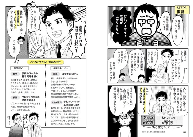 成績上位をねらう子から、まずは平均点を目指す学習習慣のない子まで、レベル別の勉強法やスケジュールなどを紹介しています。ですから子どものレベルに合わせて、マンガ内の勉強法を実践していけばOK、というわけ。