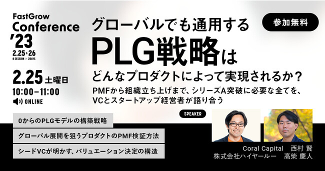 弊社COO高柴が登壇するテーマは「グローバルでも通用するPLG戦略は、どんなプロダクトによって実現されるか?」。Coral CapitalのPartner & Chief Editorである西村 賢氏と共にPMFから組織立ち上げまで、シリーズA突破に必要な全てを語り合います。
