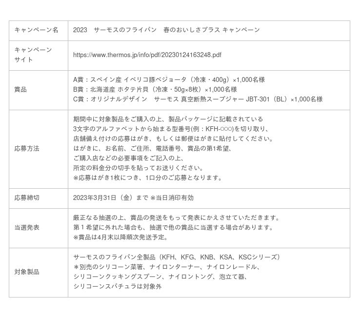 サーモスのフライパンを買って応募 『春のおいしさプラス キャンペーン』開始
