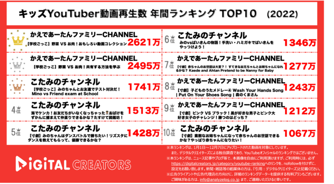 株式会社アナライズログが運営するYouTube分析ツール『Digital Creators(デジタルクリエイターズ)』が独自に調査したYouTube年間動画再生数ランキングTop10を発表します。対象は、2022年1月1日~12月7日にアップされた動画となります。20位までのランキングは下記、デジタルクリエイターズで発表しています。
