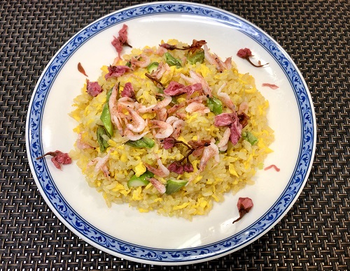 香り高い桜海老の炒飯に桜の花を添えた春らしいメニューです。