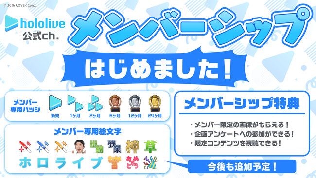 カバー株式会社(本社:東京都千代田区、代表取締役社長:谷郷元昭)が運営するVTuber事務所「ホロライブプロダクション」において、「ホロライブ」公式YouTubeチャンネルにてメンバーシップを開始したことをお知らせいたします。