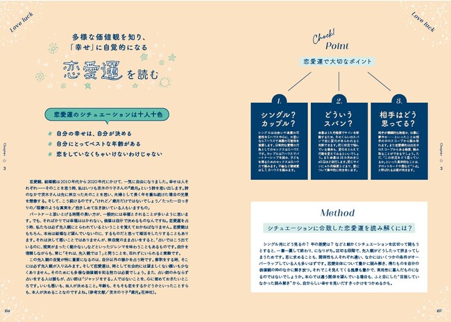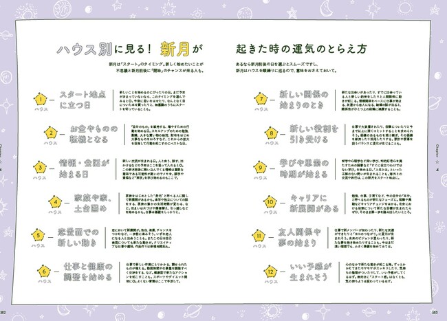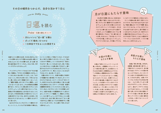 日運・週運・月運・年運で注目すべきポイントや、総合運・恋愛運などのジャンル別の運勢の読み方、新月・満月などのとらえ方も詳しく解説。