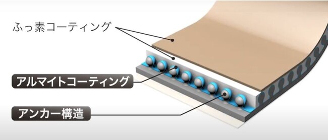 evercook独自のアンカー構造により、ふっ素コーティングをつかんではなさないため、こびりつきにくさが持続します。耐食性にすぐれているアルマイトコーティングを施しており、アルミ合金の腐食を防止し長くご使用いただけます。