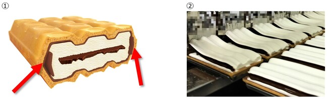 1.バニラアイスの両側面を覆うようにチョコを充填することで、上下のモナカが合わさる隙間部分からの吸湿を防ぎます。