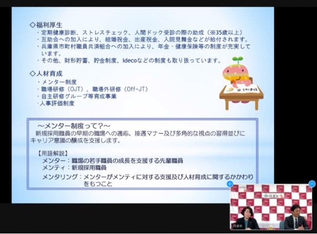 今年度からの新企画。市役所の仕事は多種多様。業務別にブレイクアウトルームを設け、参加者は興味のある業務内容のルームに行き、説明を受けました。業務内容を知ることで、就職後の具体的な「仕事」のイメージを持ってもらうことを目的にしています。参加者は熱心に質問などをしていました。