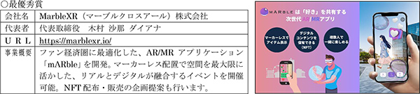 最優秀賞を受賞した「MarbleXR株式会社」は、ピッチテーマの一つである「安全でクリエイティブな都市生活、スマートでウェルネスなまちづくりの実現」に、寄与する可能性が高く評価されました。