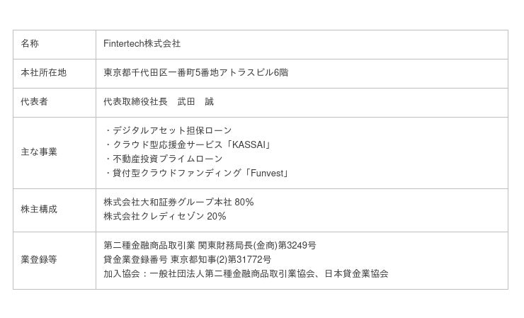 Fintertech は、大和証券グループ本社及びクレディセゾンがそれぞれ創業来培ってきた金融ビジネスのノウハウを礎としながら、最先端のテクノロジーの活用や外部企業との連携により次世代金融サービスを機動的にかつ柔軟に創出することを目指しています。暗号資産を活用した「デジタルアセット担保ローン事業」、クラウド型応援金サービスの「KASSAI事業」、投資目的で不動産を購入する際の資金を融資する「不動産投資プライムローン」を展開しています。