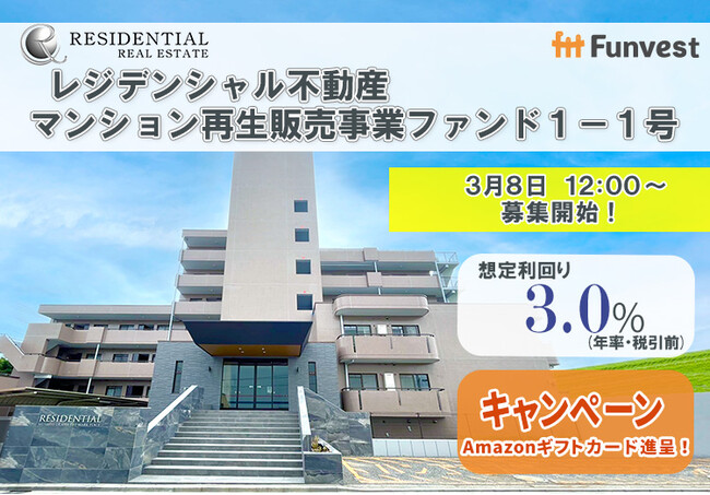 「未来をわかちあう投資」を提供する「Funvest(ファンベスト)」(以下、Funvest)は、「レジデンシャル不動産 マンション再生販売事業ファンド1-1号」(以下、本ファンド)の募集を3/8より開始しますので、お知らせいたします。