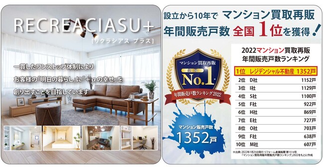 この結果、同社はリフォーム産業新聞掲載の『買取再販ランキング』のマンション部門において、全国1位となりました(2022年7月25日 リフォーム産業新聞掲載)。戸建てを含む全体ランキングでも3位と、高い実績を有しています。