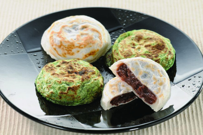 「よもぎ梅ヶ枝餅 」(5個入)650円 実演 ※よもぎは各日50点販売予定