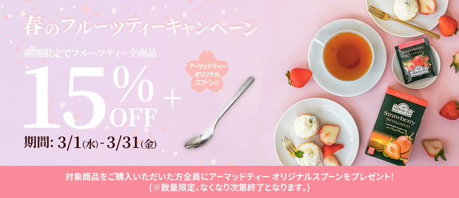 富永貿易株式会社(本社:兵庫県神戸市)は、3月1日(水)から3月31日(金)まで「アーマッドティー」公式オンラインショップにて、フルーツフレーバー紅茶が全品15%OFFでお買い求めいただける「春のフルーツティーキャンペーン」を実施しています。また、期間中に対象商品をお買い上げの方にはアーマッドティー オリジナルティースプーン(数量限定)をプレゼントいたします。