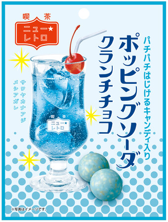 今回、そんな純喫茶のソーダドリンクをイメージした「ポッピングソーダクランチチョコ」を発売いたします。パッケージはノスタルジックな雰囲気を感じられるデザインに仕上げました。ソーダの香りがふわっと広がり、パチパチとはじけるキャンディーとクランチのザクザク食感がやみつきになる味わいです!