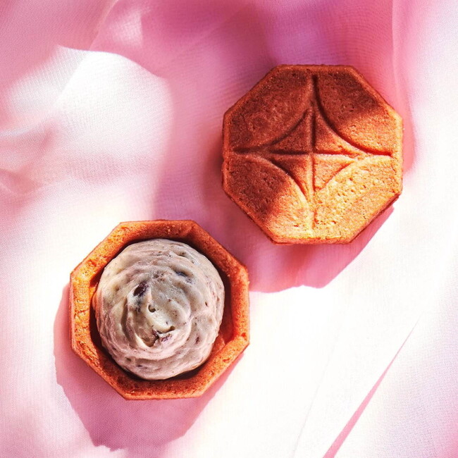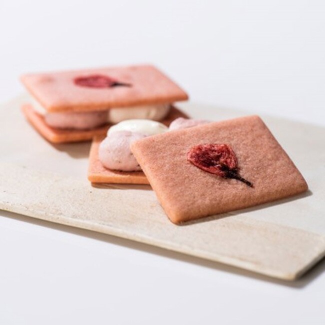 桜パウダーと桜ピューレを加えたクッキー生地に、桜葉のほのかな塩味がアクセントのバタークリームをサンドしました。