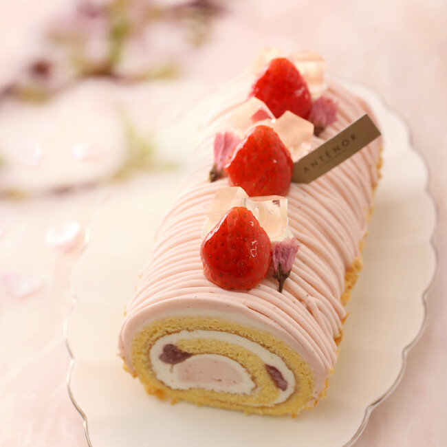 苺のコンフィチュールとさくら餡を使ったクリームをしっとりスポンジで巻きさくら餡クリームをしぼり、さくらゼリー、さくらの塩漬け、苺を飾りました。
